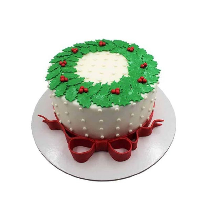 A delightful Holly Wreath Cake decorated with green holly leaves, red berry accents, and a festive red bow! This cake serves up to 15 people.