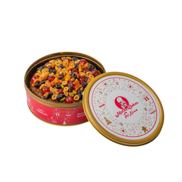 Traditional Plum Cake with festive spices and fruit soaked in orange apricot juices. Topped with glazed dried almond, fig, hazelnut, pistachio, prunes, and cherry Medium 850 gm