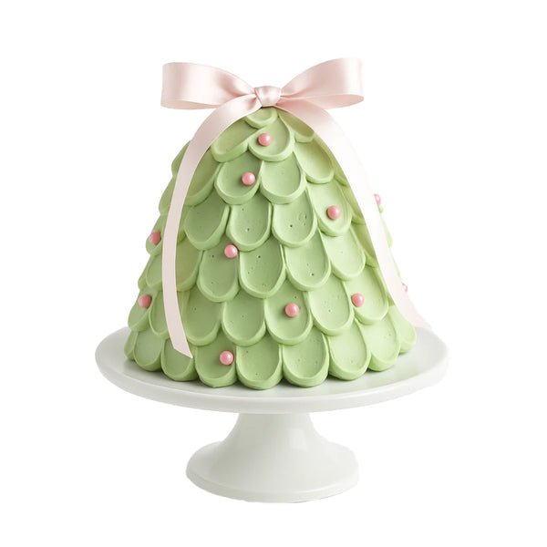 A charming Christmas tree-shaped cake, decorated with soft green buttercream layers, pink ornaments, and a satin bow — a festive showstopper for holiday gatherings.