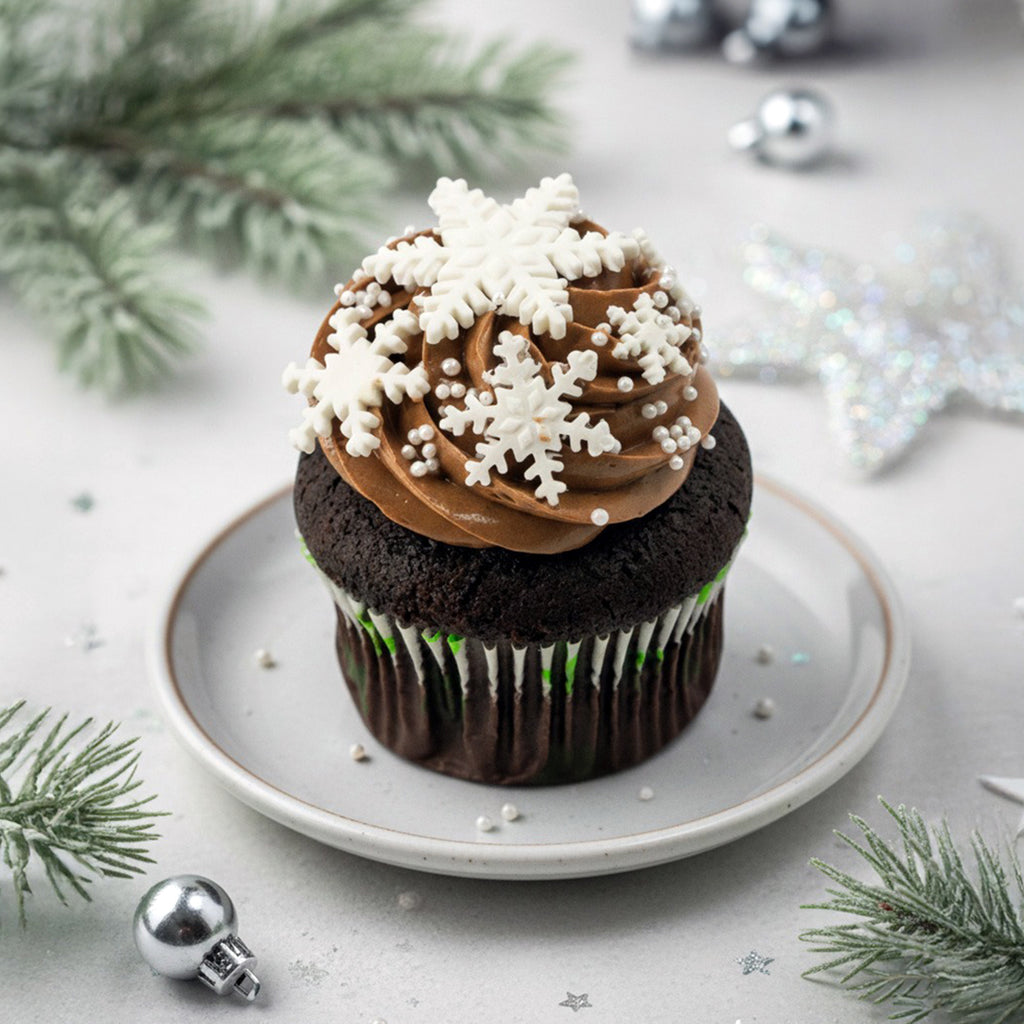 A Chocolate cupcake delicate, frosty, and full of charm—topped with shimmering snowflakes for a magical winter treat! Price per single pc.