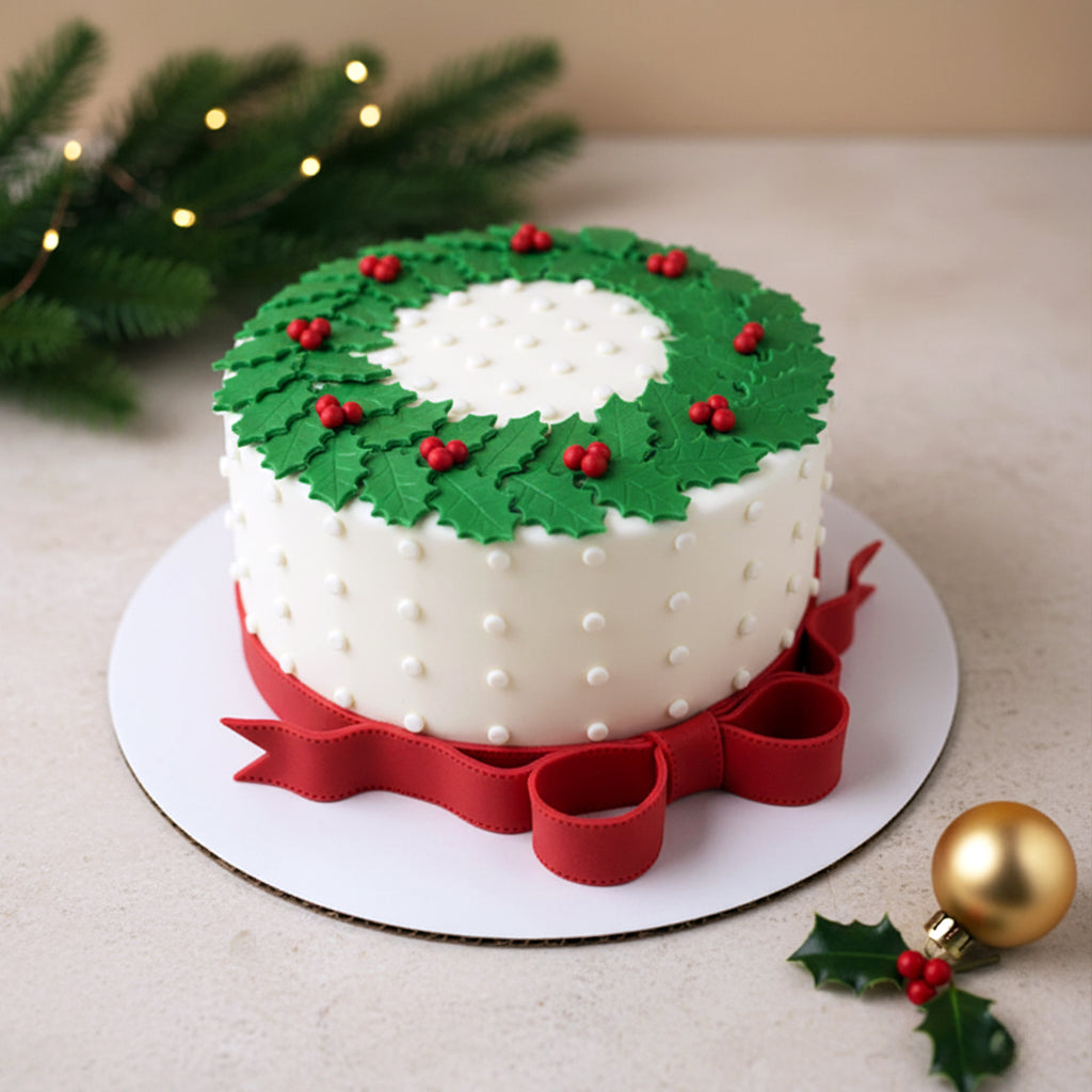 A delightful Holly Wreath Cake decorated with green holly leaves, red berry accents, and a festive red bow! This cake serves up to 15 people.