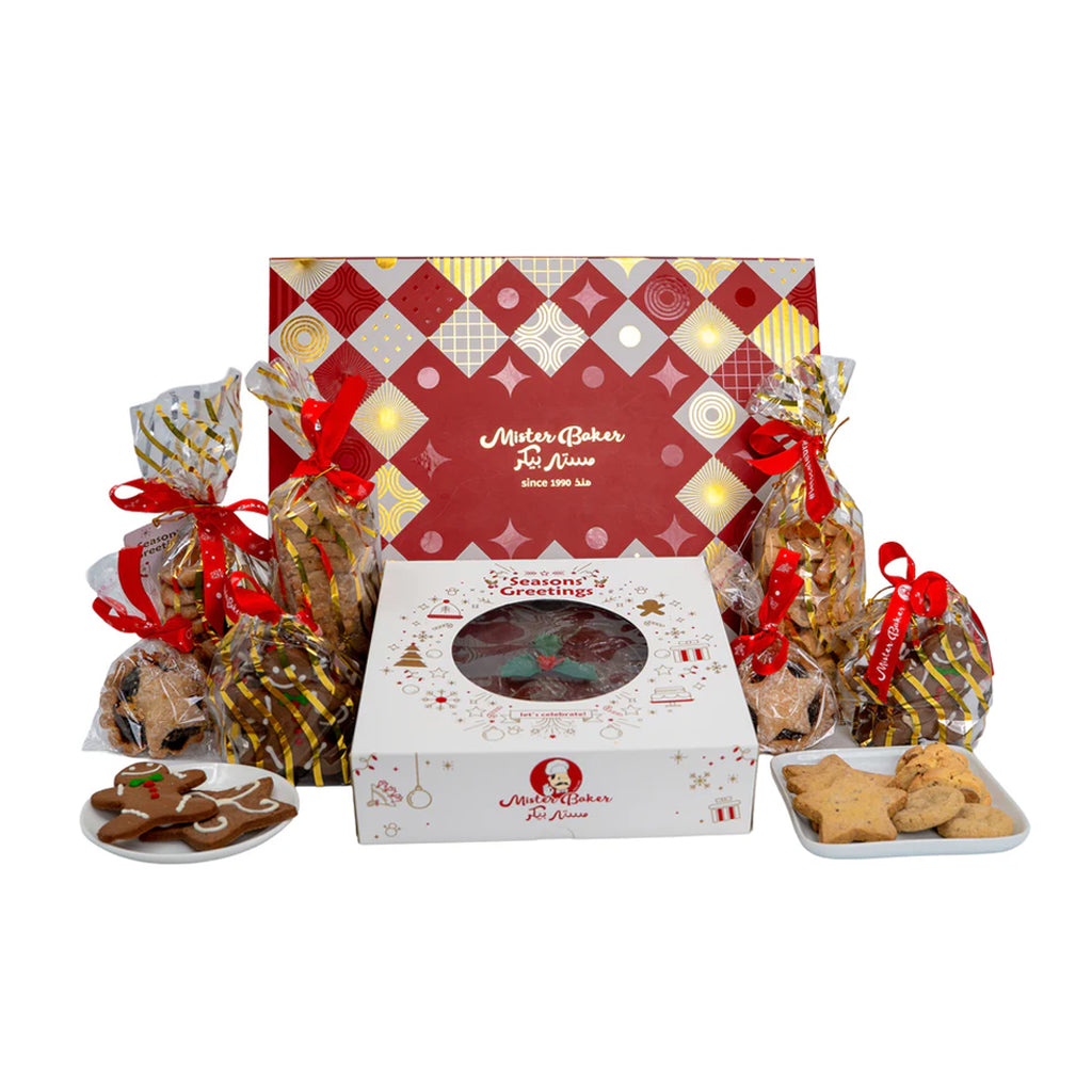A big, festive hamper loaded with plum cake, brunsli, mince pies, biscotti, vanilla stars, ginger cookies, and decorated holiday cookies — the ultimate Christmas treat box. Hamper Content : 1 plum cake 1200gm, 2 mince...