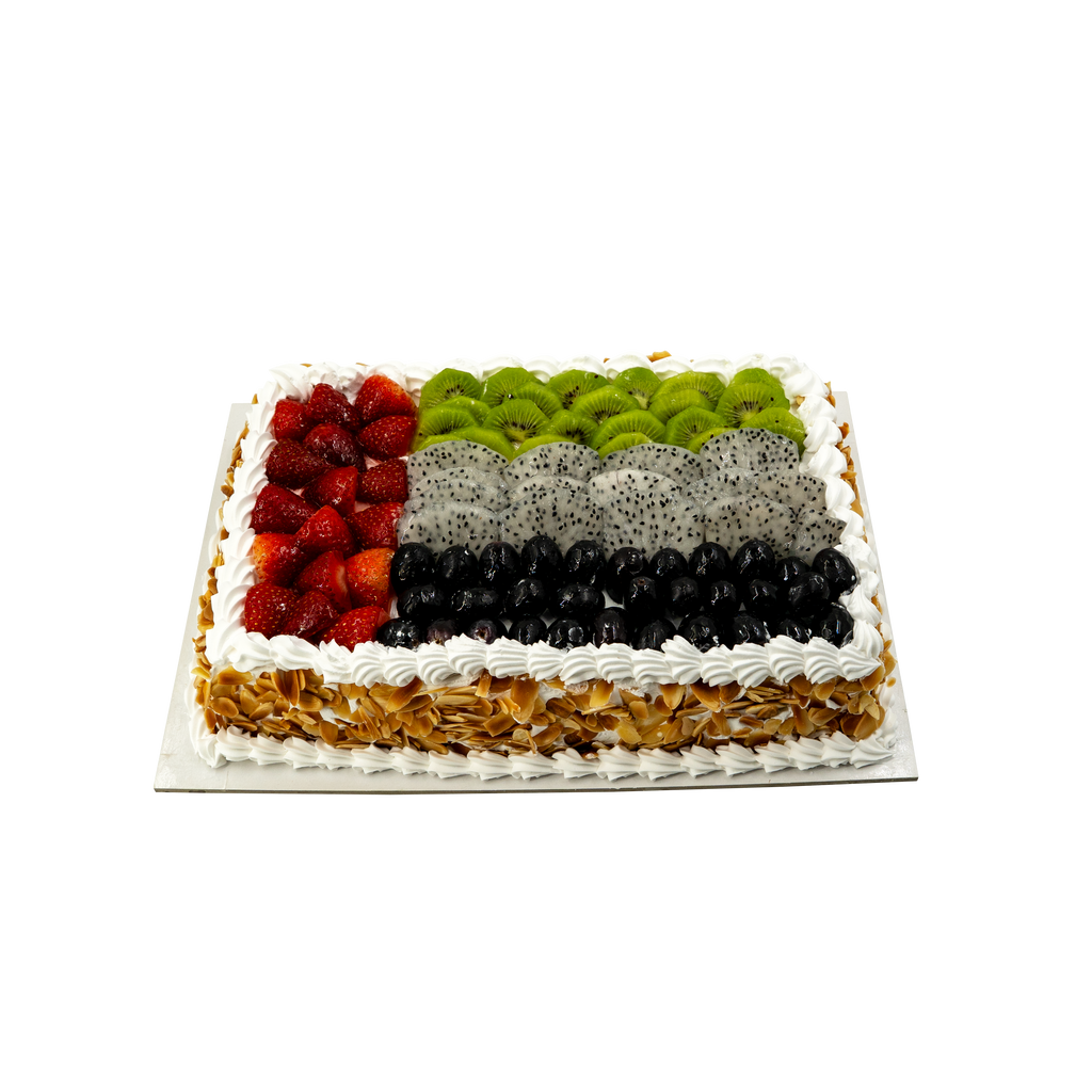 A vibrant celebration cake topped with fresh strawberries, kiwi, dragon fruit, and grapes, beautifully arranged to represent the UAE flag—perfect for National Day gatherings and patriotic celebrations.