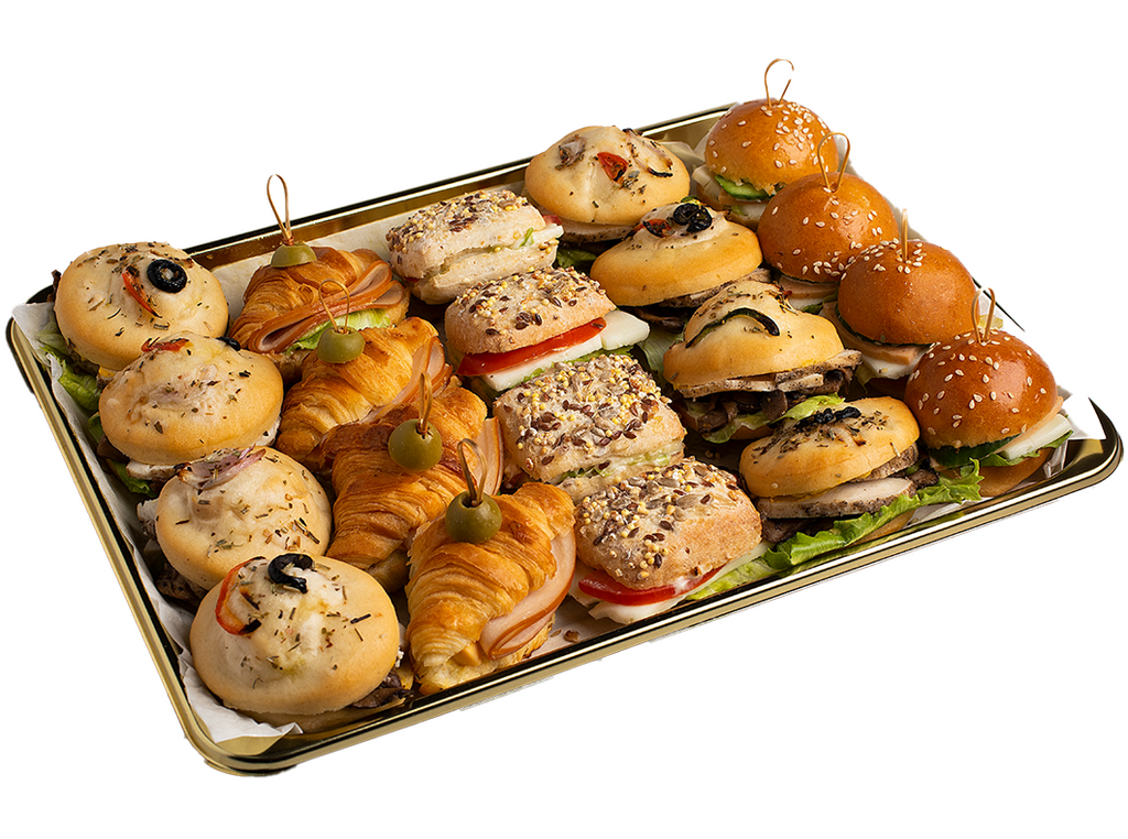 A generous assortment of veg and non-veg mini sandwiches, sliders, and croissants curated for the perfect party platter.