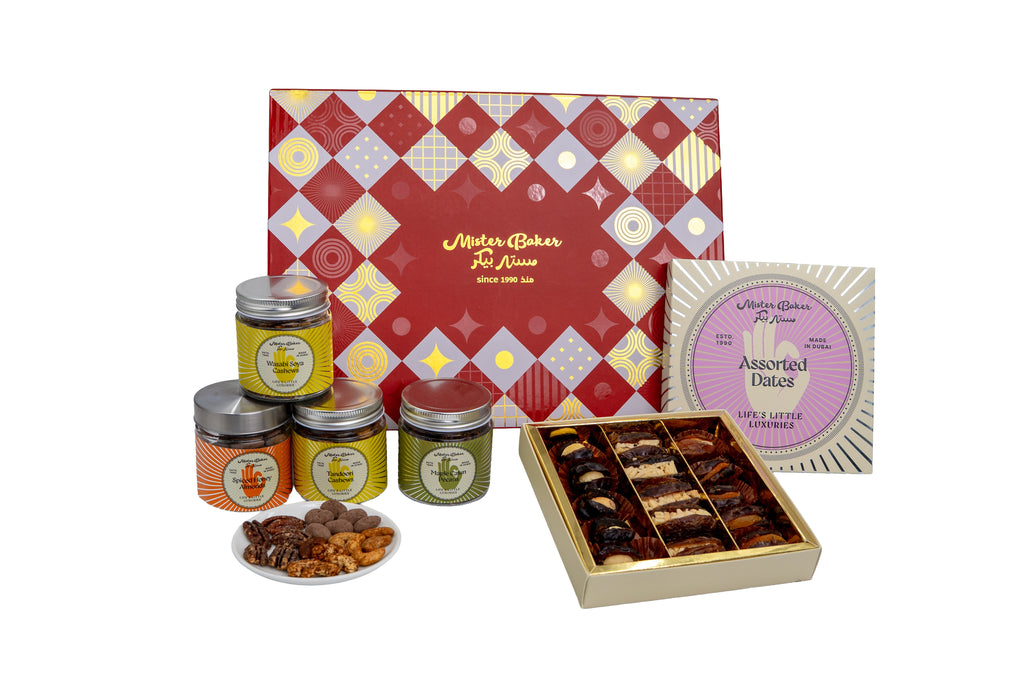 A premium Ramadan gift box featuring Dates & Delights with Tandoori cashews, Wasabi Soya Cashews, Spiced Honey almonds, and Maple & Cajun Spiced Pecans, perfect for elegant Iftar gifting.
