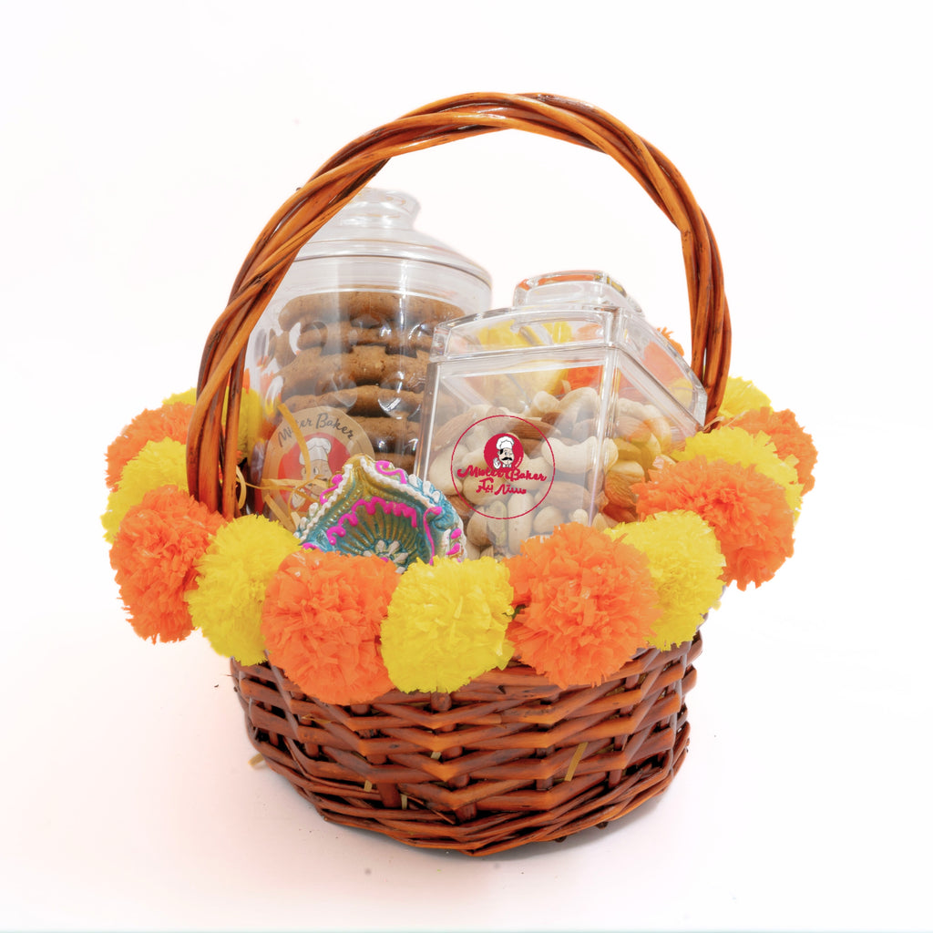 Celebrate Diwali with Diwali Joy Bites hamper, featuring chocolate chip cookie jar, assorted nuts, a traditional diya, and beautifully arranged Diwali flowers. This festive Diwali sweets hamper is perfect for gifting or enhancing your Diwali...